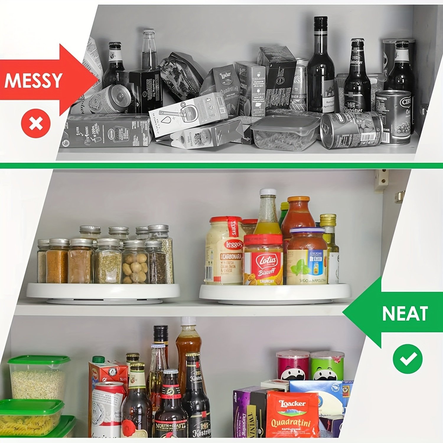 Rotates in a circle for easy access to condiments; spices; boxed food; bagged food; cans; cooking supplies; and ingredients. Also can help organize nail polish; cleaning supplies; hair supplies; bottles; soaps; and other small items . Perfect for your kitchen table; pantry; shelf; outdoor dining table; or countertop. Also great for your bathroom; office; cabinet; or vanity; Keep your kitchen cabinet or pantry neatly organized with these functional spice organizers.